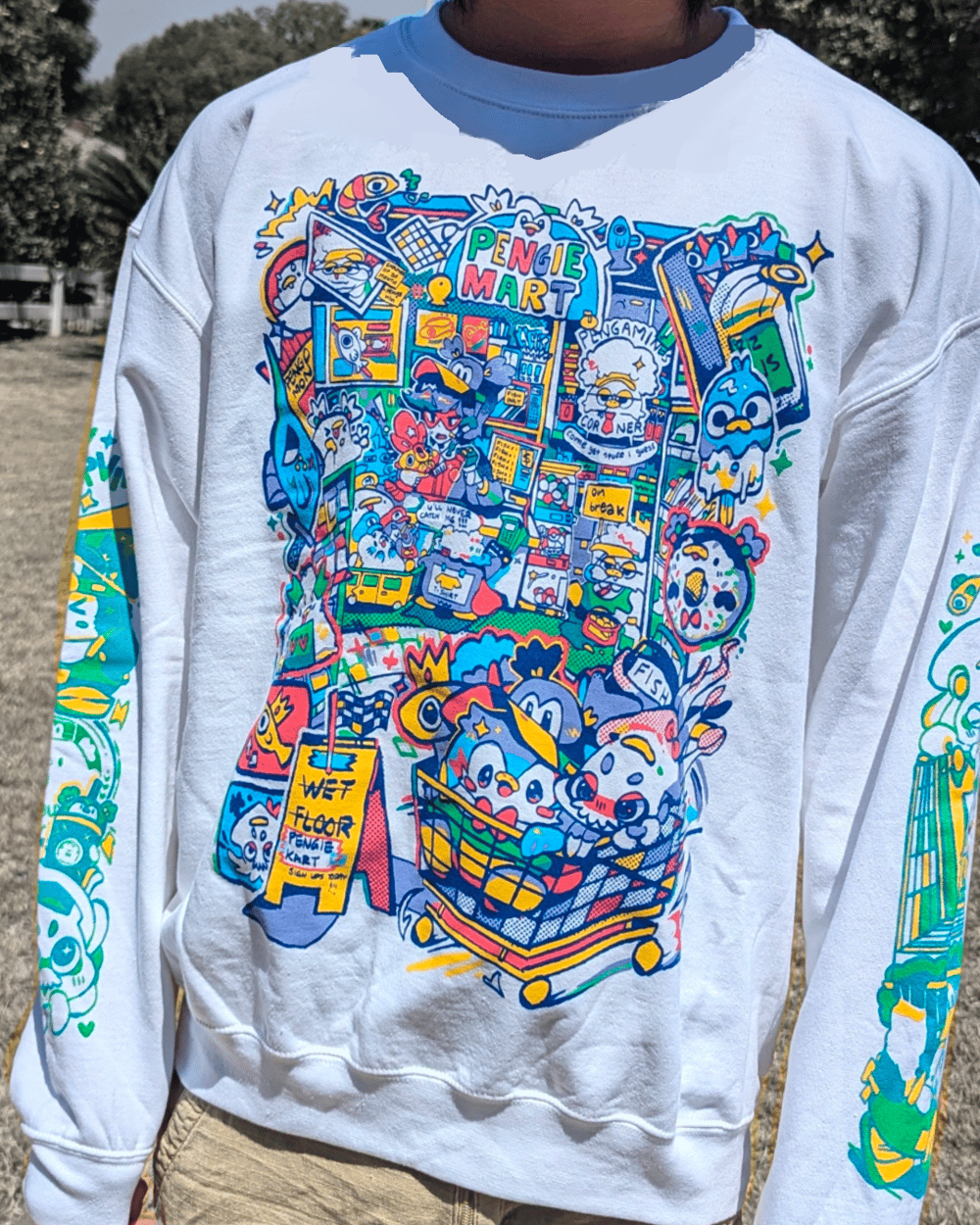 - 50/50 cotton polyester blend sweater featuring an original character and design!